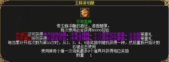 玩家每次开启玉蜂凝珀酿必得50000经验。玩家累计开启10个抽奖包,则第10次开启抽奖包获得2、3、4、5倍奖励,然后重新开始计数
