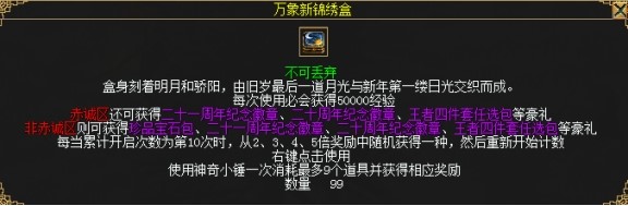 每个角色首次开启500个万象新锦绣盒时,必得一个绑定的道具:穷奇魂精•陆。