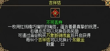 2025年12月27日0点——2026年2月9日24点,玩家可以右键点击吉祥结/如意金道具,打开活动兑换界面使用吉祥结/如意金核心兑换奖励物品。