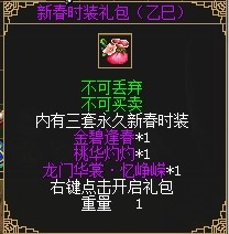 23、乙巳蛇年时装礼盒(内含金碧逢春*1+桃华灼灼*1+龙门时装*1),不绑定,售价43000元宝
