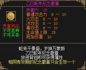 16、背包护符:乙巳蛇年纪念徽章(永久),绑定,售价30000元宝