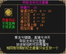 12、背包护符:甲辰龙年纪念徽章(永久),绑定,售价30000元宝