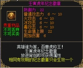 10、背包护符:壬寅虎年纪念徽章(永久),绑定,售价30000元宝