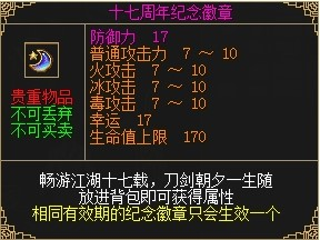 8、背包护符:十七周年徽章(永久),绑定,售价30000元宝