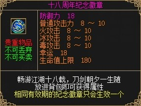 9、背包护符:十八周年徽章(永久),绑定,售价30000元宝