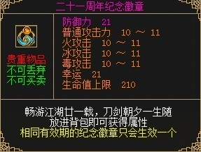 15、背包护符:二十一周年徽章(永久),绑定,售价30000元宝