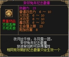 11、背包护符:癸卯兔年纪念徽章(永久),绑定,售价30000元宝