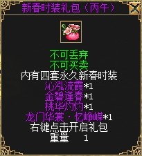 24、丙午马年时装礼盒(内含马年新时装:沁泓流霞*1+金碧逢春*1+桃华灼灼*1+龙门•忆峥嵘*1),不绑定,售价56888元宝
