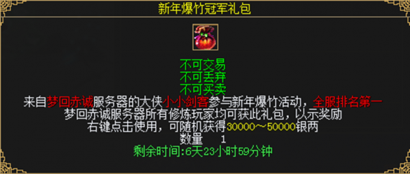 第一名角色所在服务器所有修炼角色,可获得新年爆竹冠军礼包,使用后可随机获得30000~50000银两。